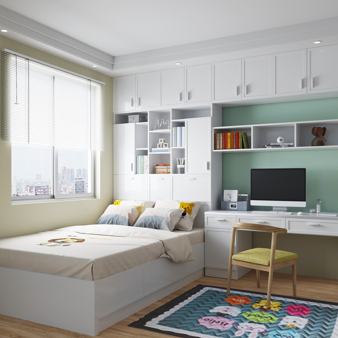 自带亲和力的原木地板,搭配一张可爱的地毯,温馨的色调下,就是生活最美的样子,定制的榻榻米,床、书柜和书桌一体化的设计,实现了空间利用最大化,让收纳变得轻松起来。