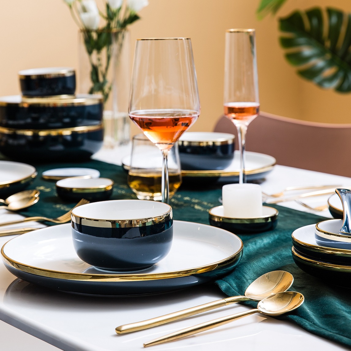 典雅轻奢的餐厅总是显得非常有格调,时尚金边点缀优雅别致的餐具,质感满满的玻璃杯,金属光泽的刀叉,不同的搭配总能组合出不同的魅力。