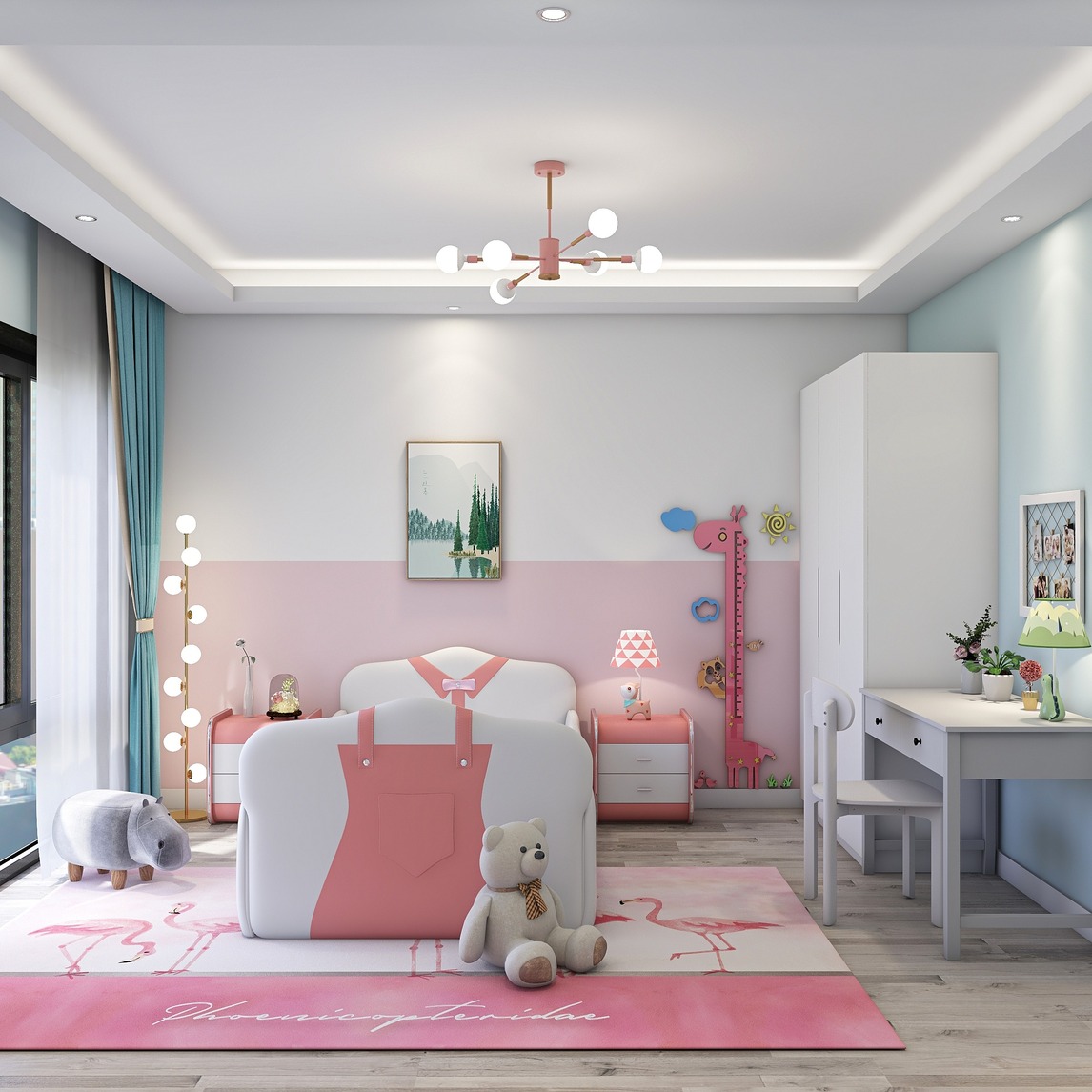 儿童房设计是整个房屋设计的一个部分,主要侧重于对孩子的性格、年龄、爱好等考虑而给出的合理的设计。整体的色调为粉色调,搭配粉色皮卡床、粉色吊灯、台灯、落地灯,营造一个温馨梦幻的公主房。
