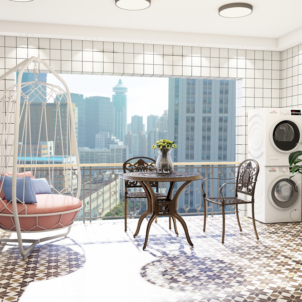 洗衣机烘干机户外家具秋千并存的阳台空间