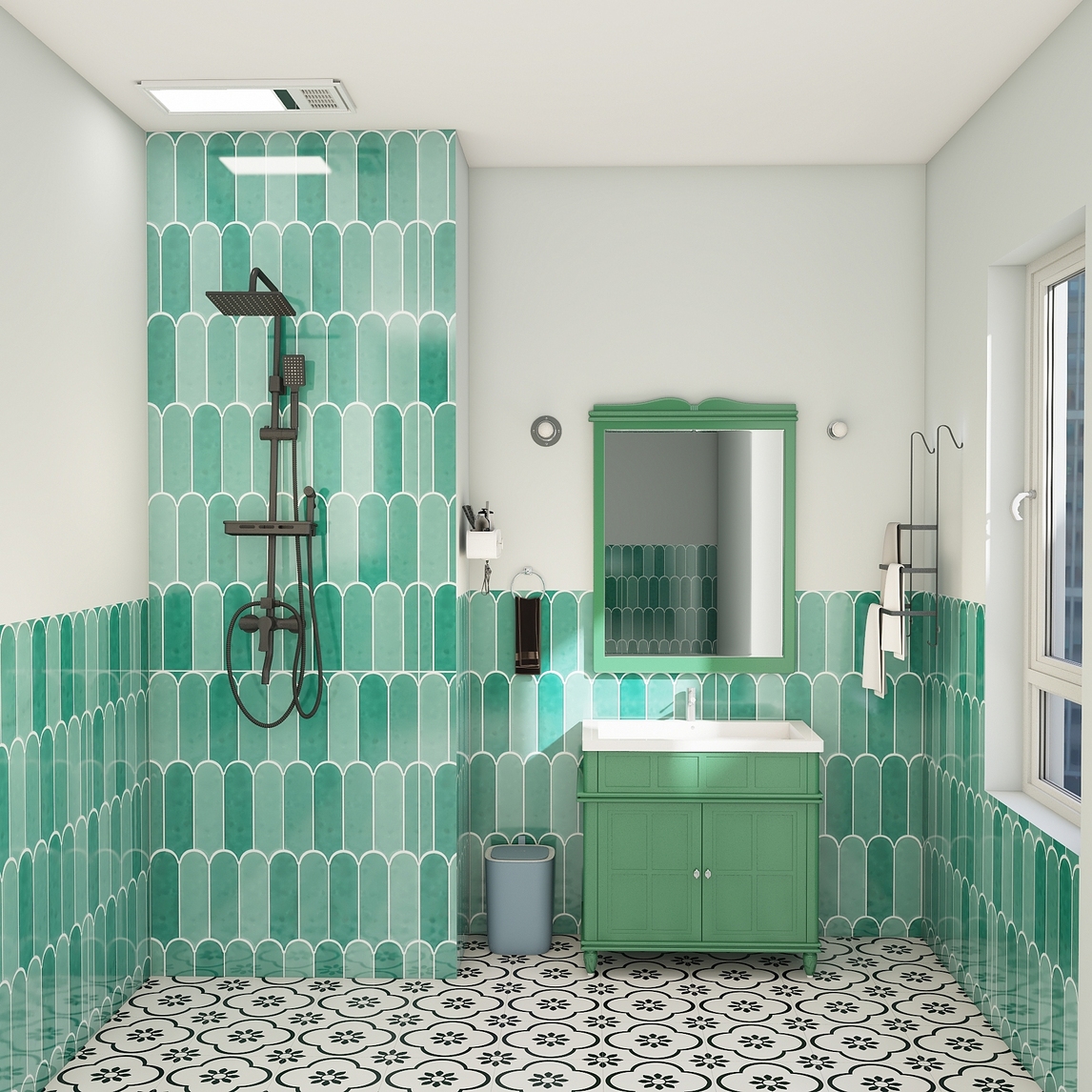 浴室采用绿色渐变花砖搭配花纹地砖,打造出摩登气息十足的前卫浴室。木质复古浴室柜简约自然,更具实用性。垃圾桶、毛巾架等物品摆放合理,不占取多余空间。花洒利用浴室原本设计,巧妙的与其他物品隔离开来,不必担...展开