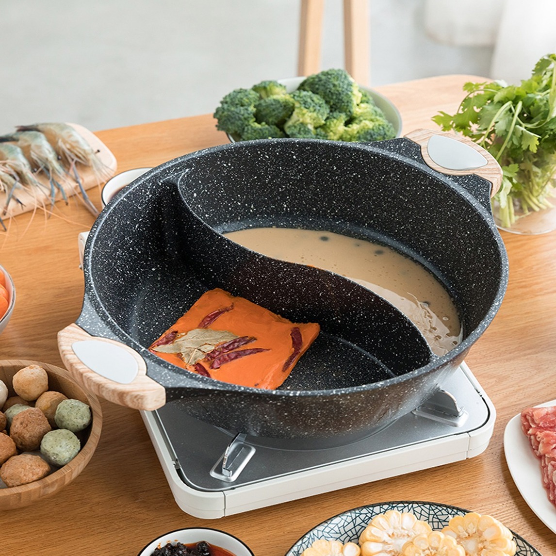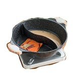 吃火锅,传统焊接搁板的鸳鸯锅因为技术限制总会有轻微的串味儿,因为焊点不会万无一失,这款麦饭石的一体成型绝对杜绝串味。