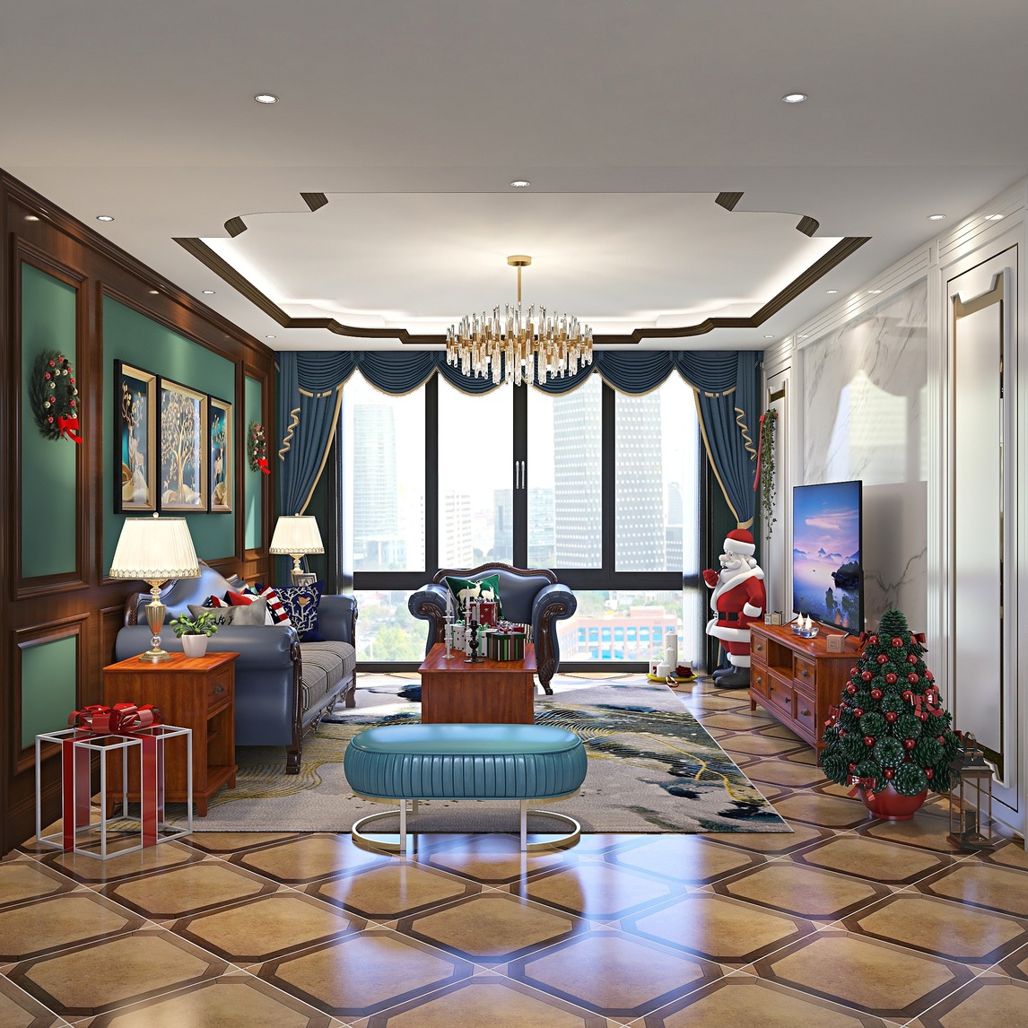 简美偏爱自然、怀旧,背景墙为实木护墙板结合墨绿色墙漆设计,搭配实木皮艺沙发、茶几、轻奢黄铜质感的灯具,整体奢华大气,搭配圣诞元素的装饰品,又充满节日的喜庆与热闹感。