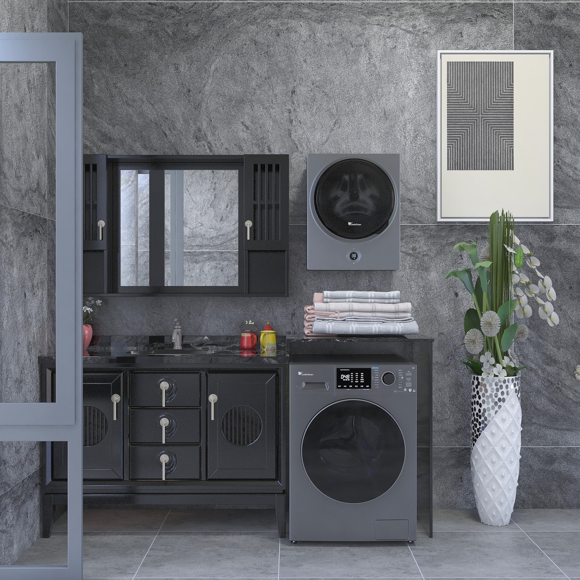 卫生间以黑白灰为主题来设计搭配,墙面融入工业风元素,为空间增添强烈的时尚感,精致的浴室柜搭配小天鹅的两台高颜值洗衣机,让整个空间精致感油然而生,完美的实现沉稳的风格与多功能的和谐统一。