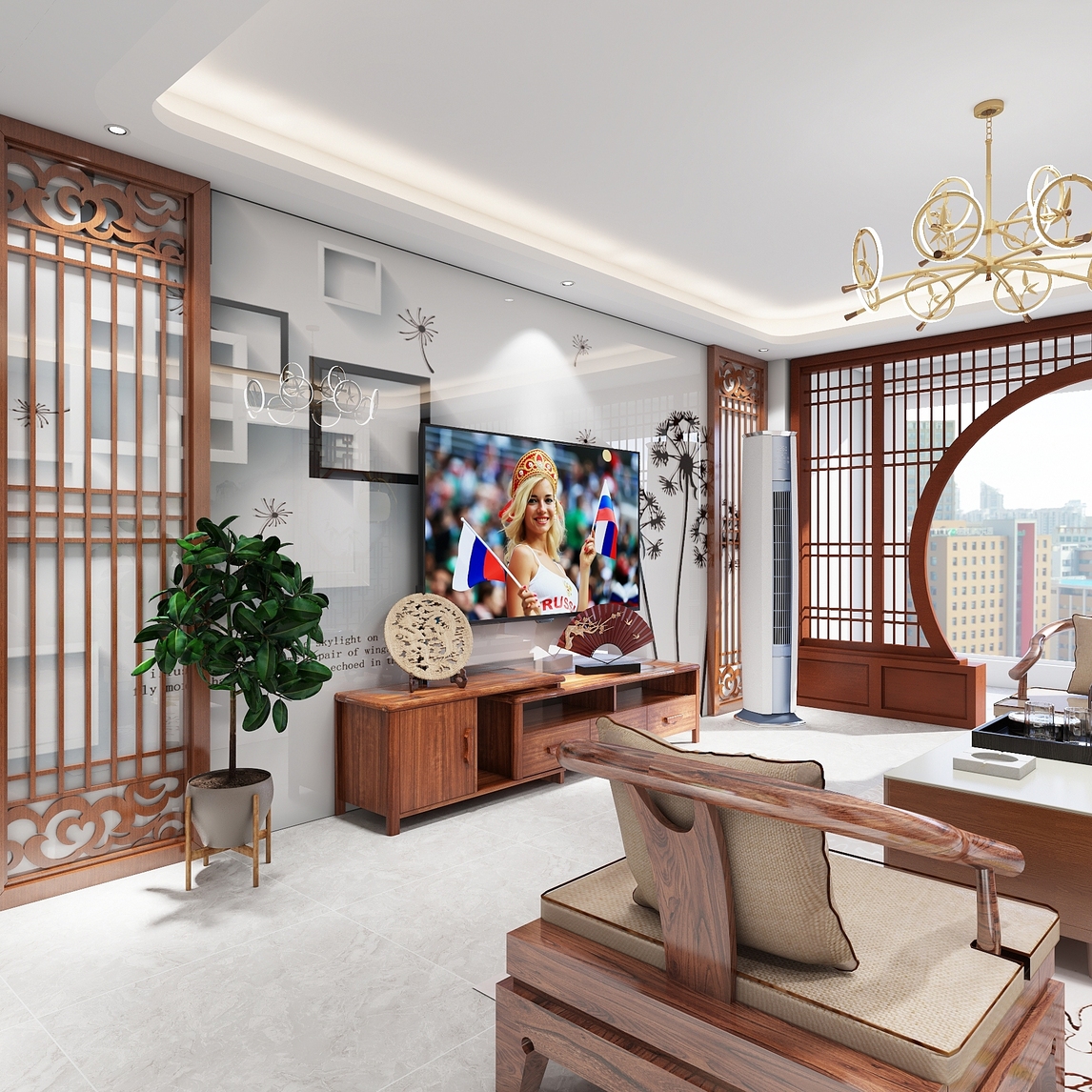 一进门就能感受到整个环境的舒适雅致,电视背景墙选用直线镂空花格,顶面造型采用硬朗简洁的直线条,突显出男业主正直、刚正不阿的性格。沙发背景墙选用抽象的山水画与地毯相呼应,使得整个空间氛围轻松有趣。