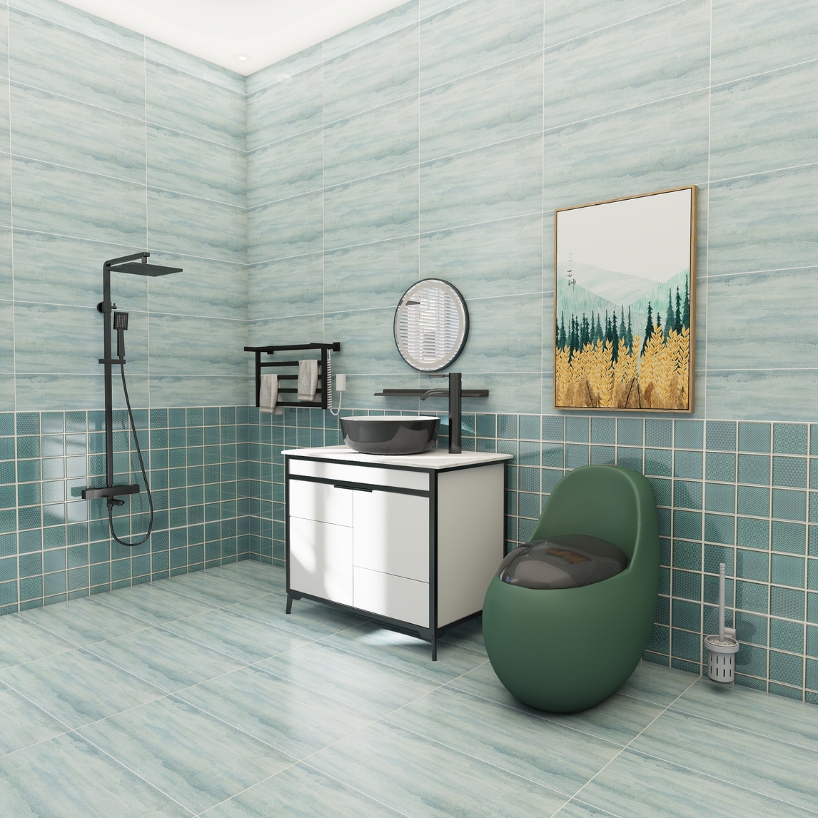 是不是还在烦恼浴室怎么搭配?绿色的瓷砖搭配绿色的马桶,黑白的浴室柜,哑黑的恒温花洒,使用极简的设计语言,彰显高档的设计卫浴空间。