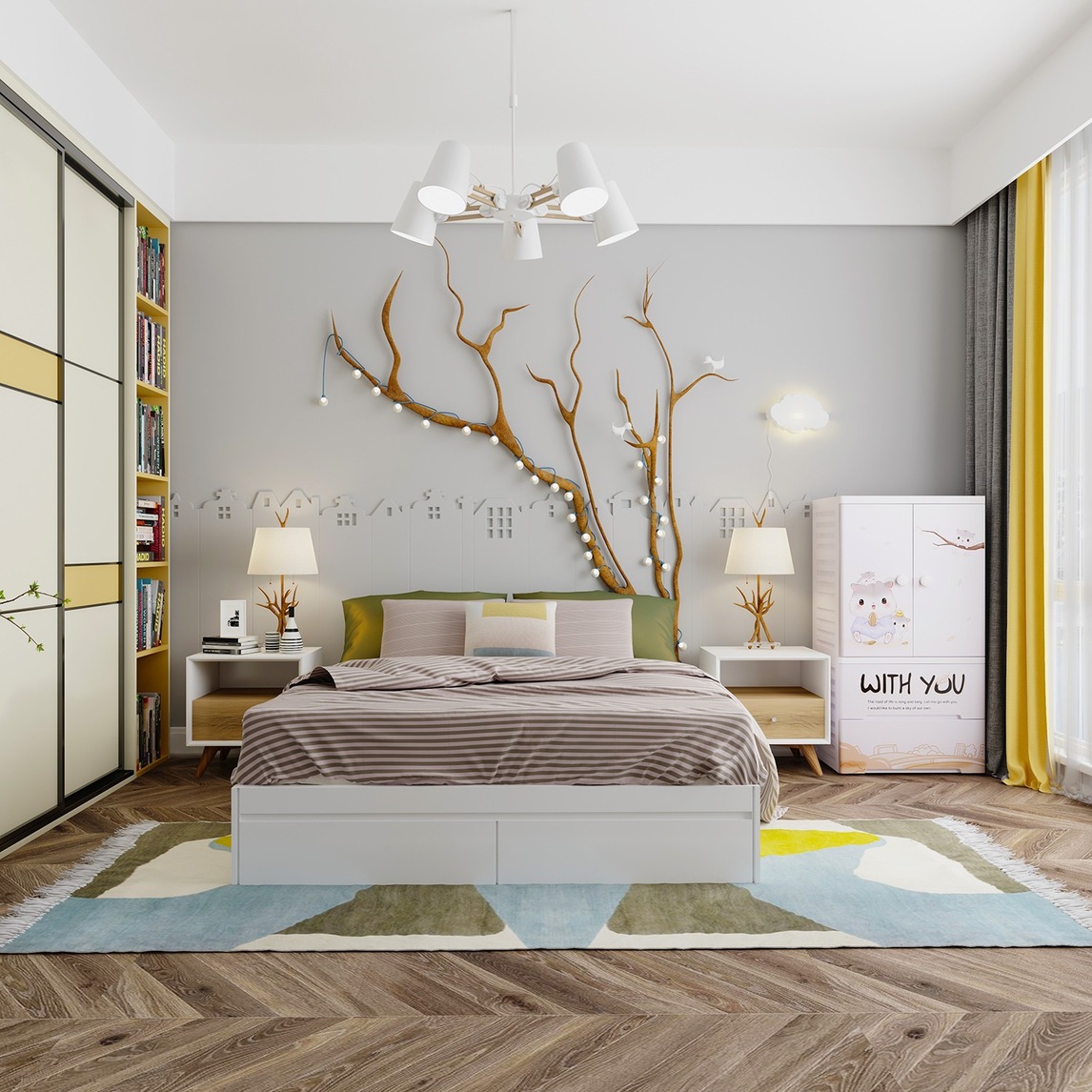 树枝于墙身装饰,营造出一股冬日潮流感,挂上小灯饰,仿佛是在迎接圣诞假日的来临。可爱的雪人卡通收纳柜更加是增添了卧室的趣味,再搭配两个床头柜,让卧室在充满童趣的同时不失实用功能。