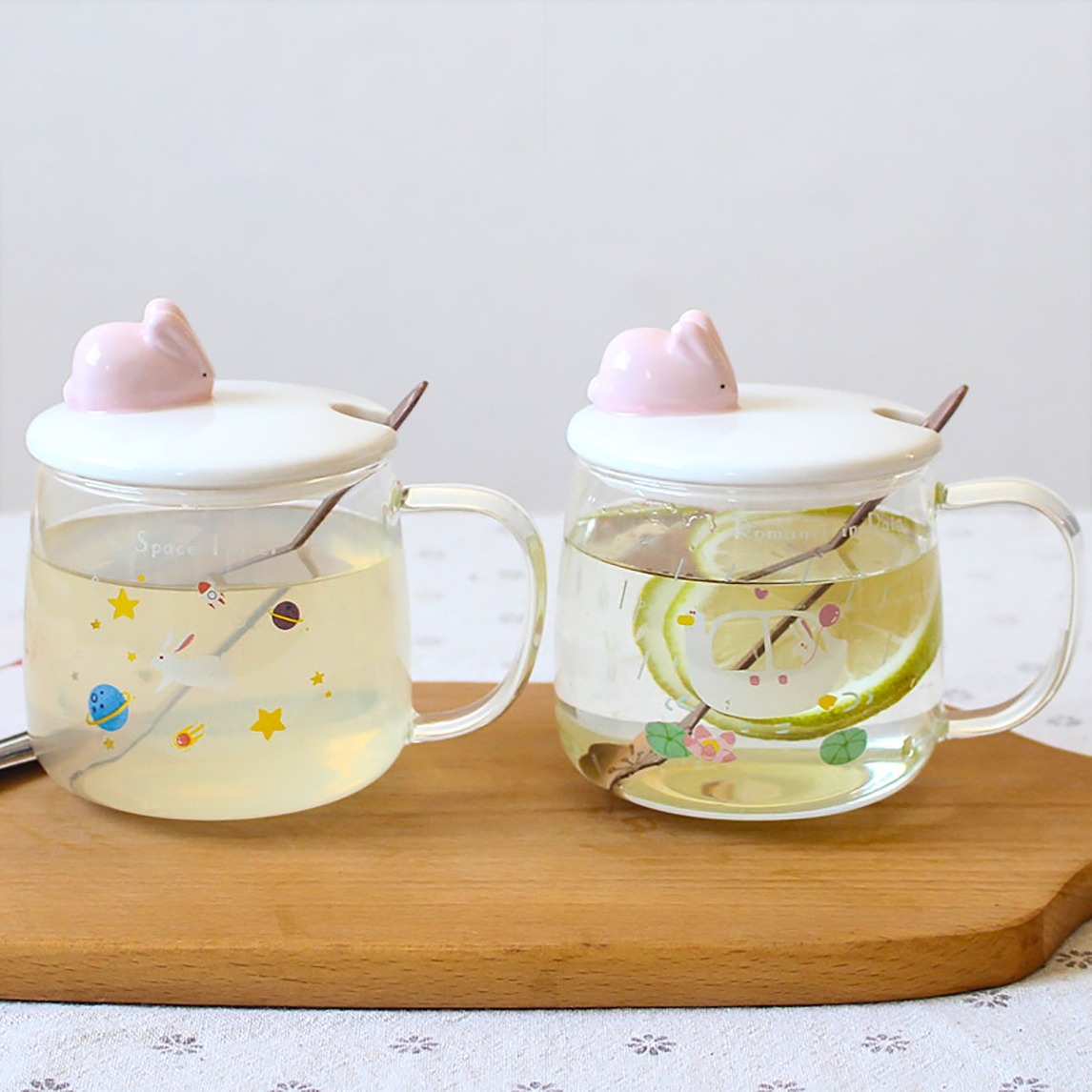 这个杯子超级可爱,有小兔子杯盖,保鲜又防尘,兔子一次烧制成型,好拿不脱落。通透玻璃材质,冷热通用,杯身线条圆润流畅。