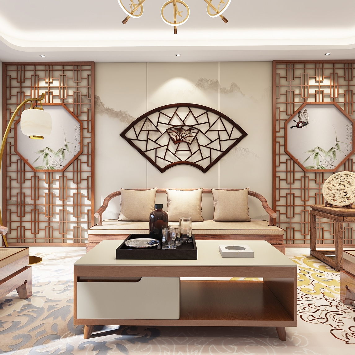 一阵浓郁的中式的光辉从窗外照射进来。运用中式园林的花窗元素最为电视机背景墙,与后面的茶室空间的光感虚实结合、交相辉映。硬装上的构思,无不体现了设计师独特的设计理念以及传达了业主的修养与审美。软装上的搭...展开
