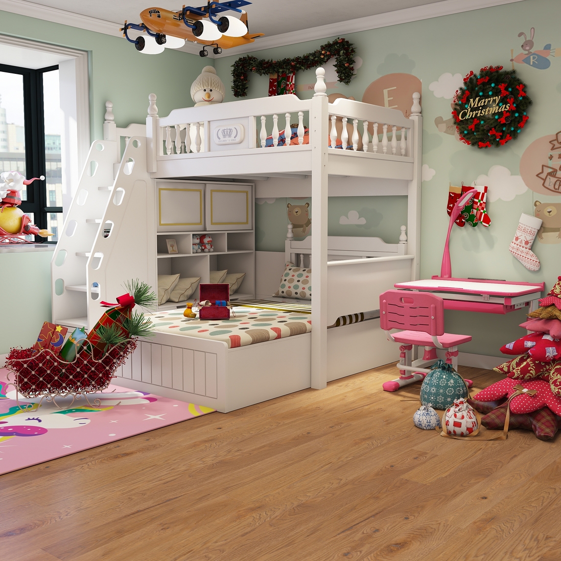 整体以浅绿色为主色调,搭配田园风高低床,使得整个氛围更有童趣。地毯可以根据男孩女孩来搭配,让孩子在地上可以玩玩具,同时具有一定防护作用。