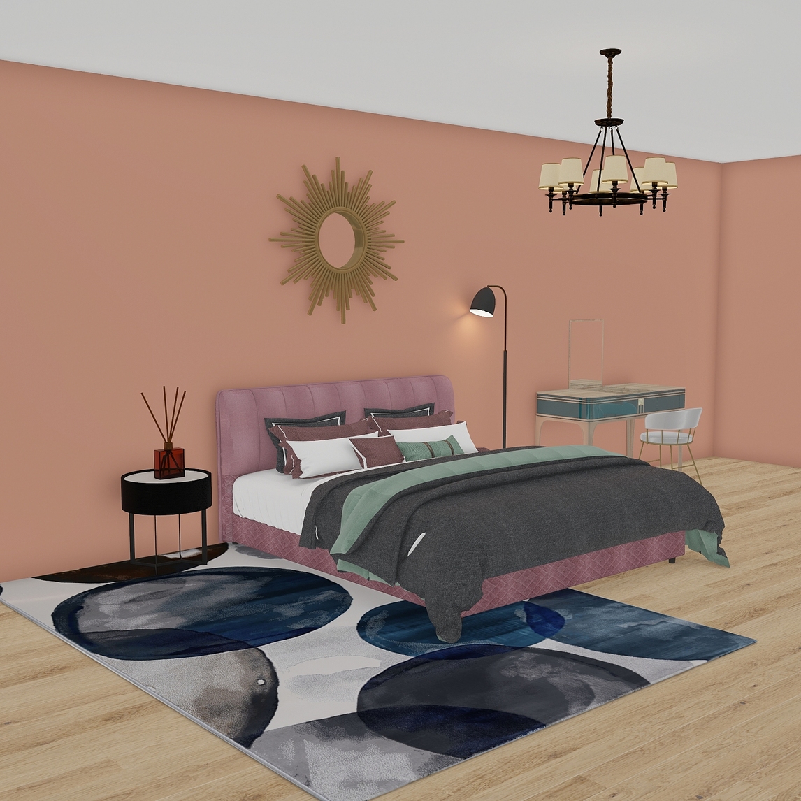 卧室采用复古气息浓厚的绿色和紫色搭配,在橘色掉墙面的基础上显得颜色十分浓烈,这总大胆的颜色运用营造出一种优雅而轻奢的复古风,当然,这也是一个适合睡眠和休息的空间。
