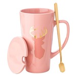 粉色,麋鹿的头像,同时麋鹿金色鹿角,让杯子美翻天际,显得很有情调,让喝水也变得有趣起来,用来喝奶、咖啡都很好,颜色简约,设计精美,手柄的设计符合人体工程学,拿起来非常方便