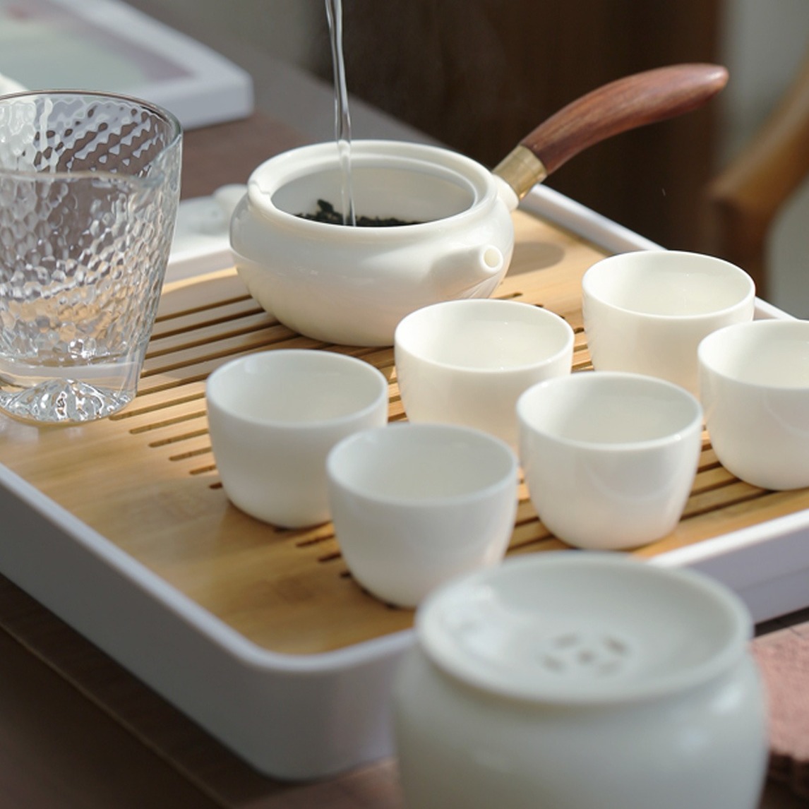日式的陶瓷茶壶有非常纯洁白的外表,外表圆润处理,散发非常有设计感的家居用品,茶具都是用骨瓷制作,质感满满,搭配实木托盘的感觉典雅又高级。