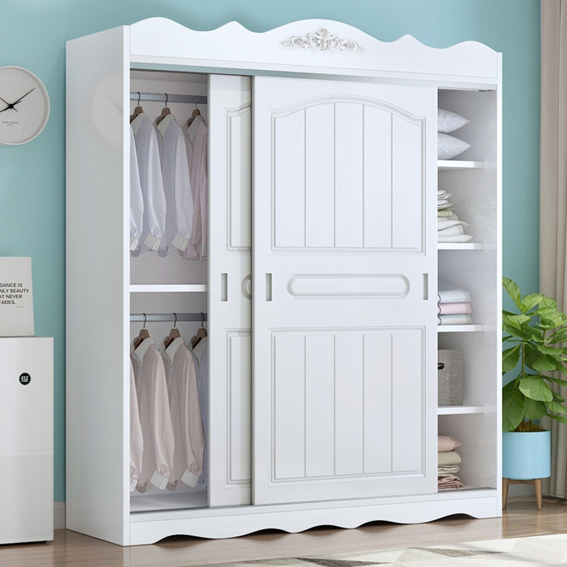 这一款衣柜,造型美观,柜子门是雕刻工艺,防水耐划,健康环保,它有大容量的储物空间,收纳空间更加多元化,是一款属于你的好家具。