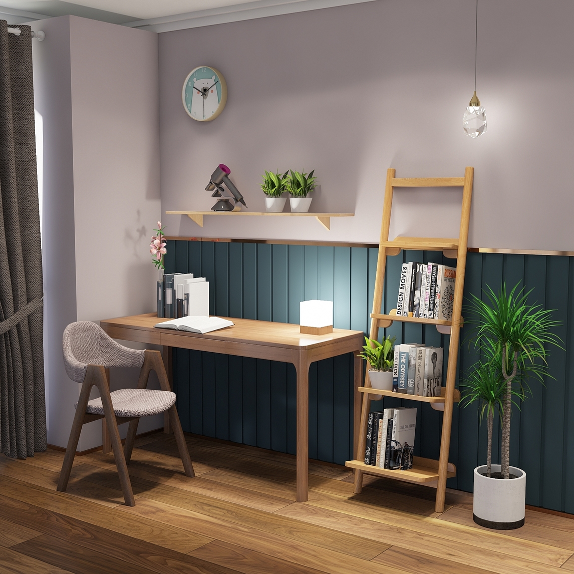 宁静温馨的书房,在实木的书桌选用最棒的灵感,搭配漂亮的台灯学习夜读都非常合适。选用的一个好的置物架,放置植物还是书籍由您来选择。