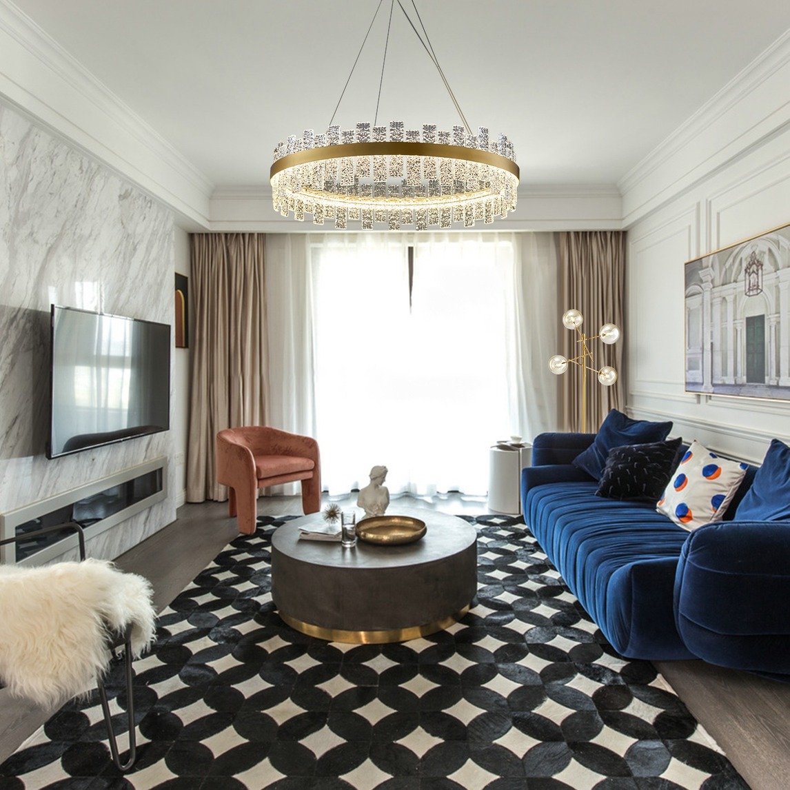 水纹水晶的吊灯,圆环形灯带发光,透出光感朦胧唯美梦幻,看着就喜欢。丝绒格调的沙发,线融的”模糊”质感,让空间透出更加柔和的触感。 浪漫很简单,就是水晶的璀璨在你的家折射出柔光,柔情便漫步家居之中翩翩起...展开