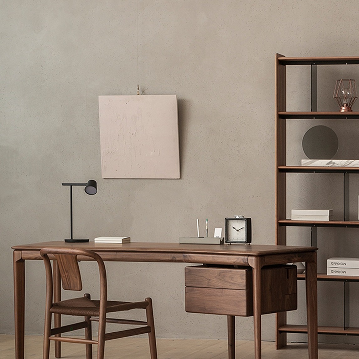 灰褐色的墙壁搭配微黄的地板,让整个空间散发着一股“土”味儿,却又是自然的味道。实木书架,格子设计,增添个了美感,加长的办公桌搭配实木电脑椅,将“土”味儿进行到底。