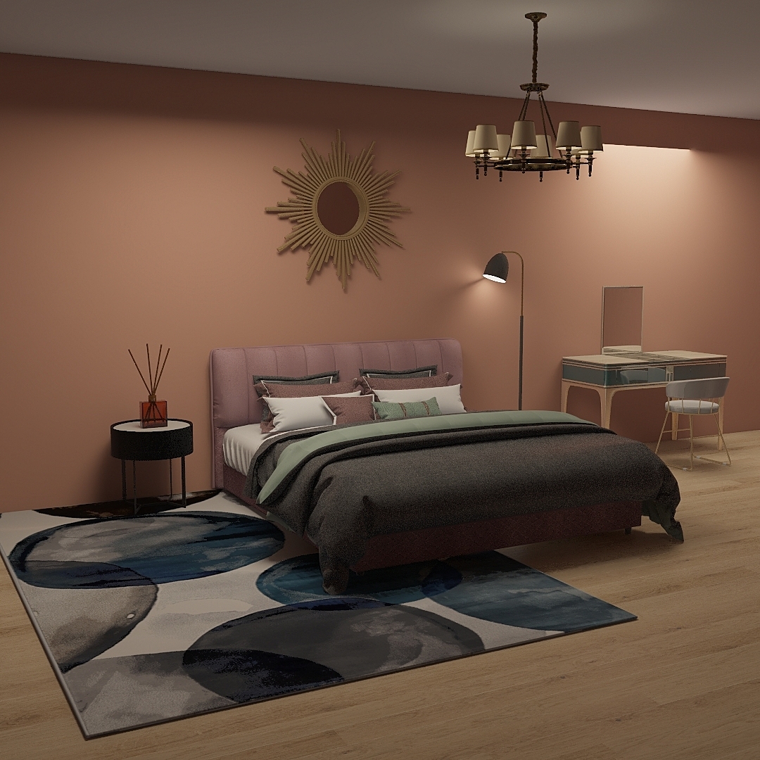 卧室采用复古气息浓厚的绿色和紫色搭配,在橘色掉墙面的基础上显得颜色十分浓烈,这总大胆的颜色运用营造出一种优雅而轻奢的复古风,当然,这也是一个适合睡眠和休息的空间。