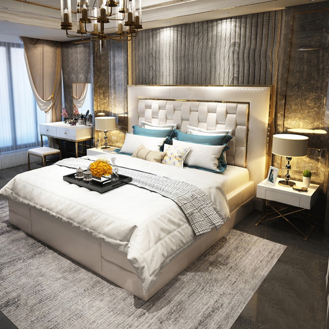 轻奢风这样的家居氛围想必是很多人所追求的,毕竟现在的快节奏生活,累了一天回到家,今天这组卧室舒适的真皮双人床会让你有好好的躺床上休息的感觉,加上白色与金属色的搭配瞬间提升格调,高级感满满。