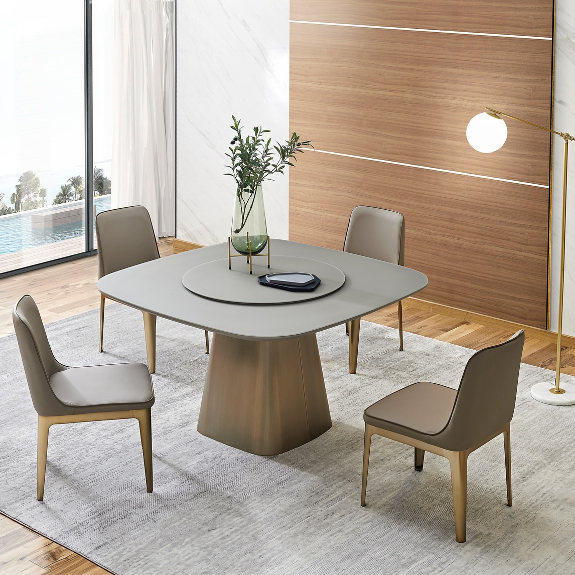 整体比较注重个性、舒适,以现代简约线条设计为主,采用钢化玻璃、不锈钢等材料混合搭配出通透感,以桌子的线条贯穿整个空间,平放式转盘易于清洁、方便日常使用,桌面做斜边、圆角处理安全防撞,桌面和转盘面板均使...展开