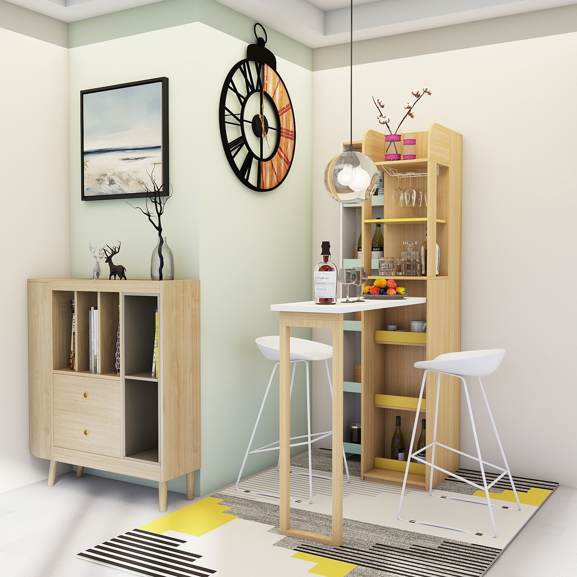 木艺的吧台和餐边柜是质朴简单的日式风格,罗马挂钟和创意吊灯则是乡村美式和简约北欧风,搭在一起十分清新。