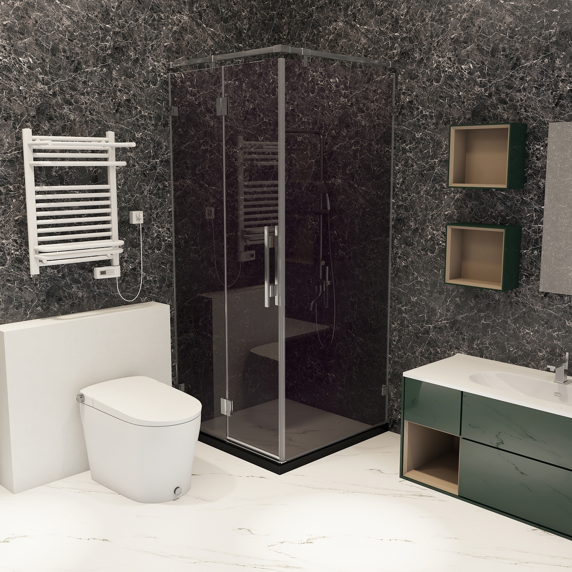 墙面黑色网纹瓷砖,地面采用白色大理石纹理瓷砖,黑白对比强烈;淋浴房采用灰色玻璃,与墙面相辅相成,浴室柜则采用墨绿色浴室柜,也显得更自然和谐