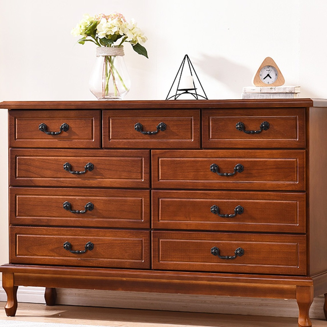 实木制作,给您一个温馨舒适的家,爱无处不在!储物柜和多个储物抽屉设计收纳容量大,让你的家居更整洁干净。简欧设计时尚百搭,精致拉手。