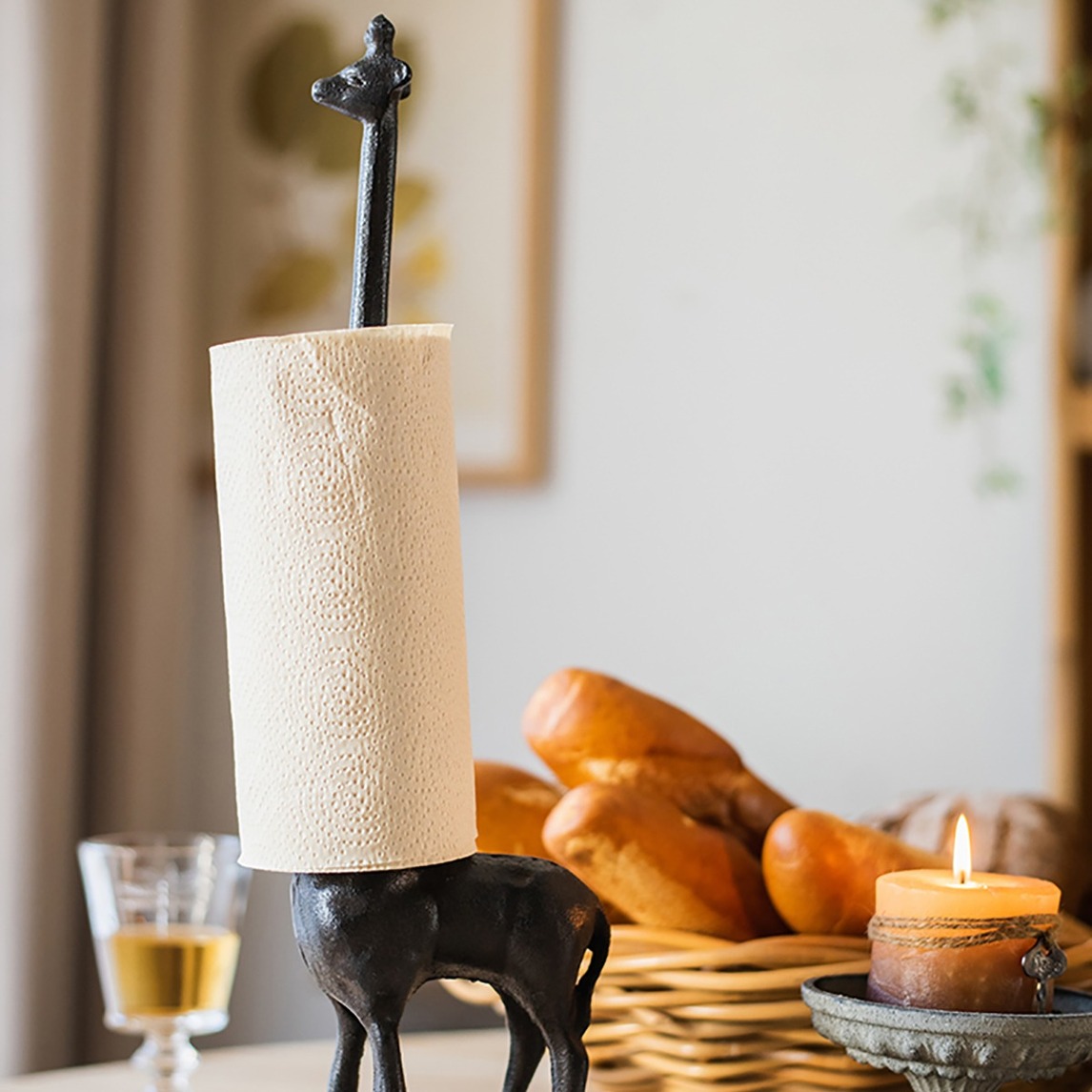 餐厅有一只长颈鹿,铸铁的,脖子超长的,可以放置卷筒纸,方便拿取。同时,它也是一个不错的艺术摆件,融入家中,给家增添生机。
