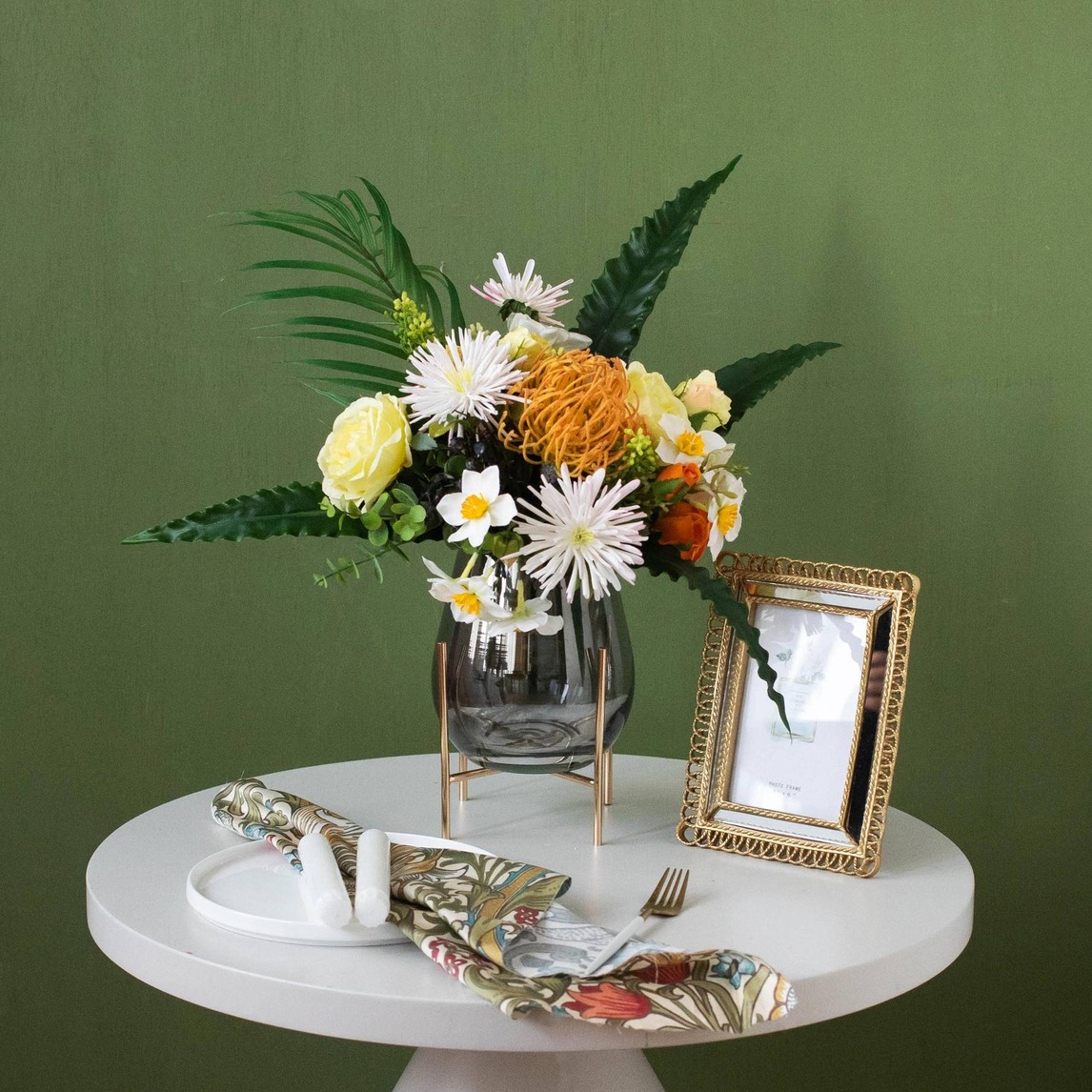 在各种颜色中,绿色可以说是气质最独特的,说到典雅复古一定会有绿色。这次墙纸就选择了非常耐看的苔藓绿。根据28法则,白色的小圆桌占据了空间20%的视觉平衡点。摆上一盆颜色贴合度较高的仿真花束,让空间顿时...展开