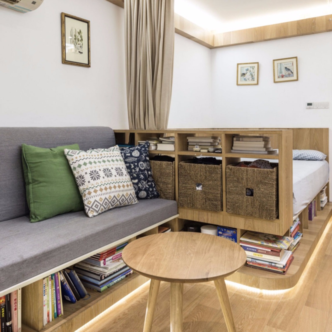 作为爱好读书单身一居室的人士来说,满屋的书能有一个收纳的床柜是最好的选择,搭配精致的画框打破场景的单调,为你的空间营造良好的意境景象,实木简易的茶几,整体感觉整洁优雅不凌乱。