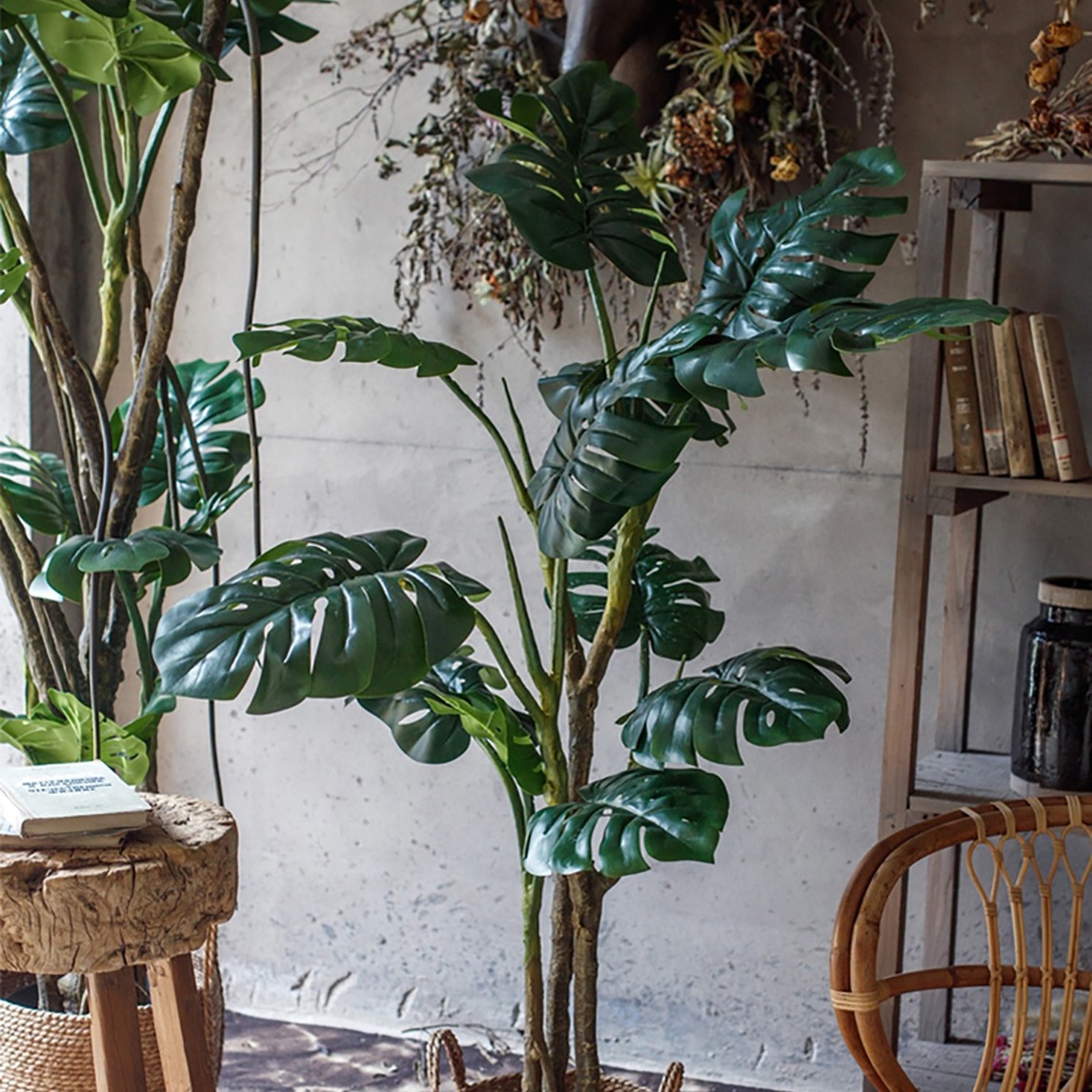 大型的仿真植物,龟背竹绿植摆件,叶子很大,墨绿的颜色,看着绿油油的,给书房自然气息,搭配藤编花盆,又有一种复古的味道。