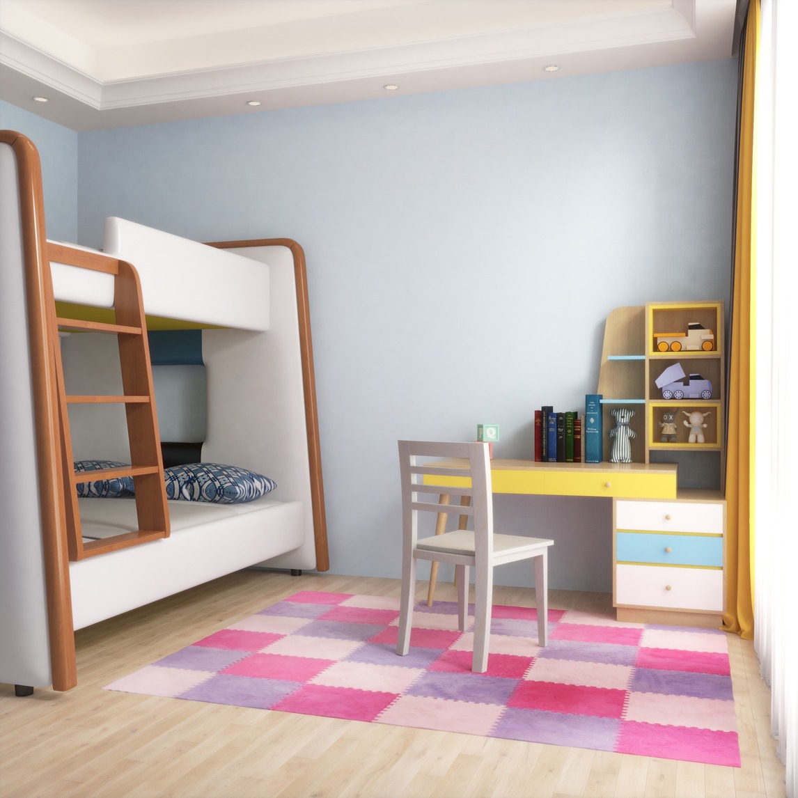 实木的上下铺设计,上铺边边带有护栏,有效地防止孩子掉落,同时,宽大的楼阶,孩子上落更加安全。粉系的地毯搭配一张活力黄的书桌,增添了孩童的乐趣感。