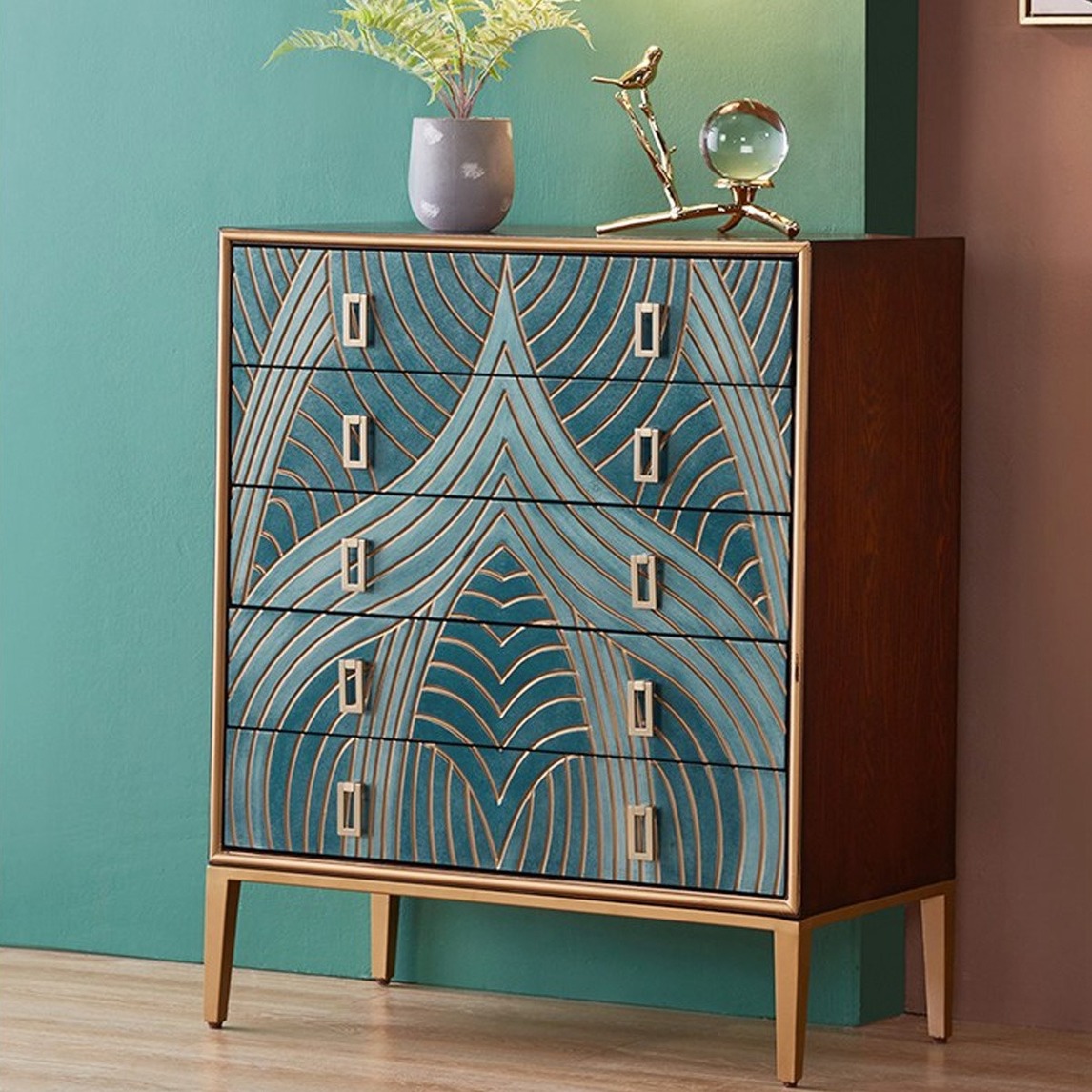 淡雅而内敛,配合森系细节软装,营造平和舒缓的空间氛围。金色边框盒抽屉设计,充满质感,展现出美式风格的奢华与典雅,同时给居室增添一些轻松的归属感。