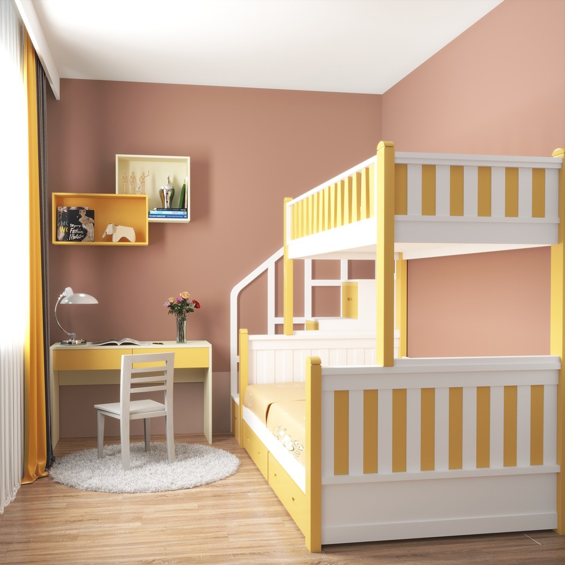 整个房间以黄色调为主,活泼温馨,上下床的设计,不仅节省了空间,且实用性强,收纳功能强大,书桌和吊柜的组合,科学分区,还能培养孩子从小收纳的好习惯。