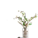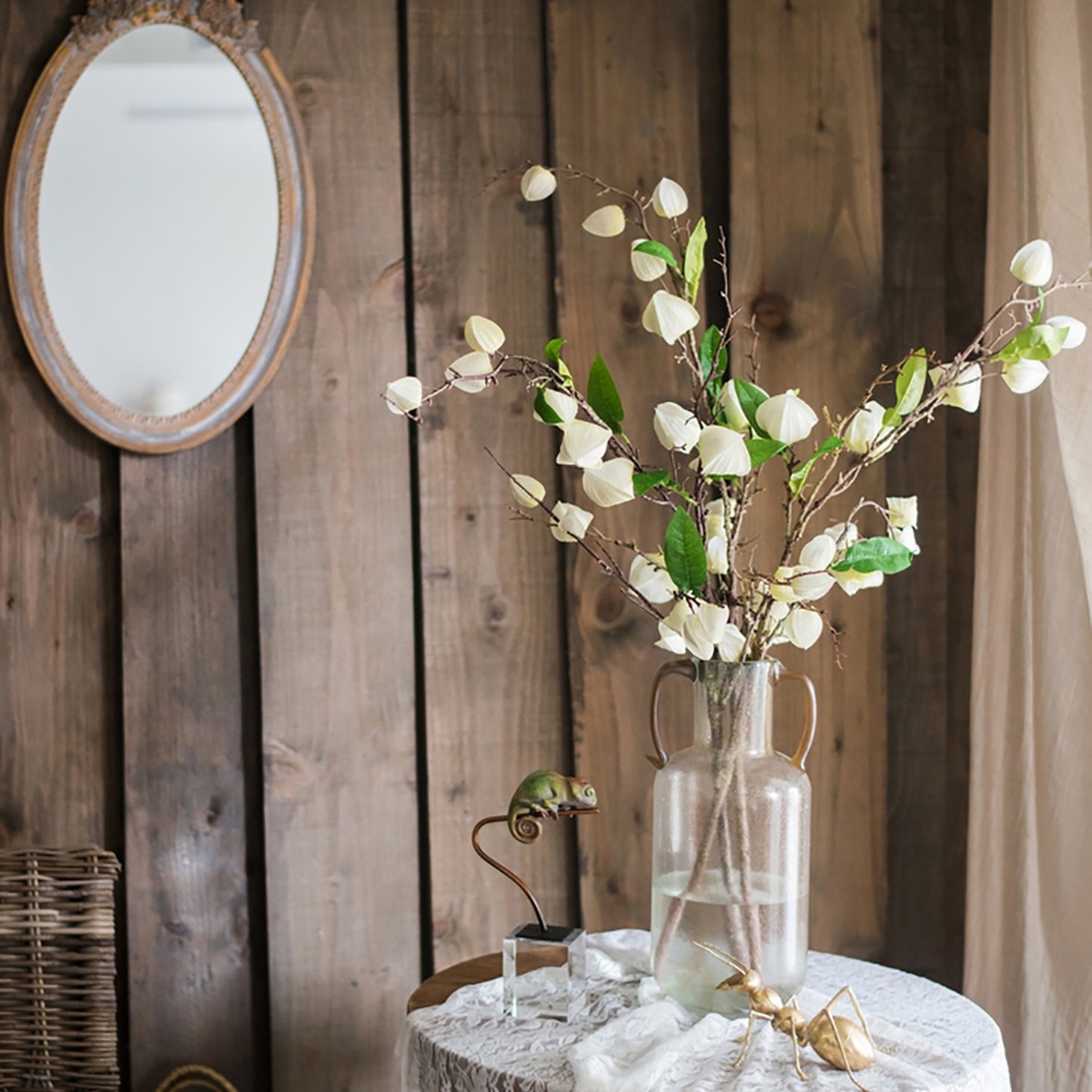 客厅偏复古的味道,雕花的镜子,手工棉麻的窗帘,藤编的椅子,带着浓浓的怀旧味道,相比而言,透明的桌布 ,仿真白色的洛神花,看着就文艺多了,给整个空间增加了一抹小清新。