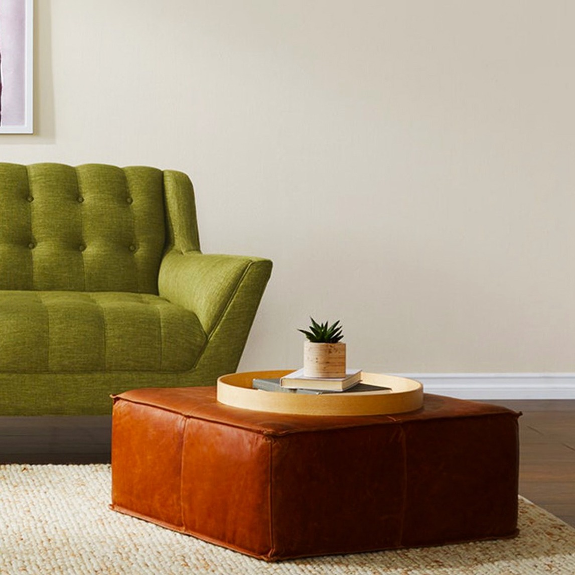 复古的皮艺沙发凳皆可以用作座椅,也可以在休息时用作小茶桌,将托盘摆放在沙发凳上,人就坐在柔软舒适的地毯上,舒适惬意。复古棕色的沙发凳与绿色沙发搭配,很有复古风格。