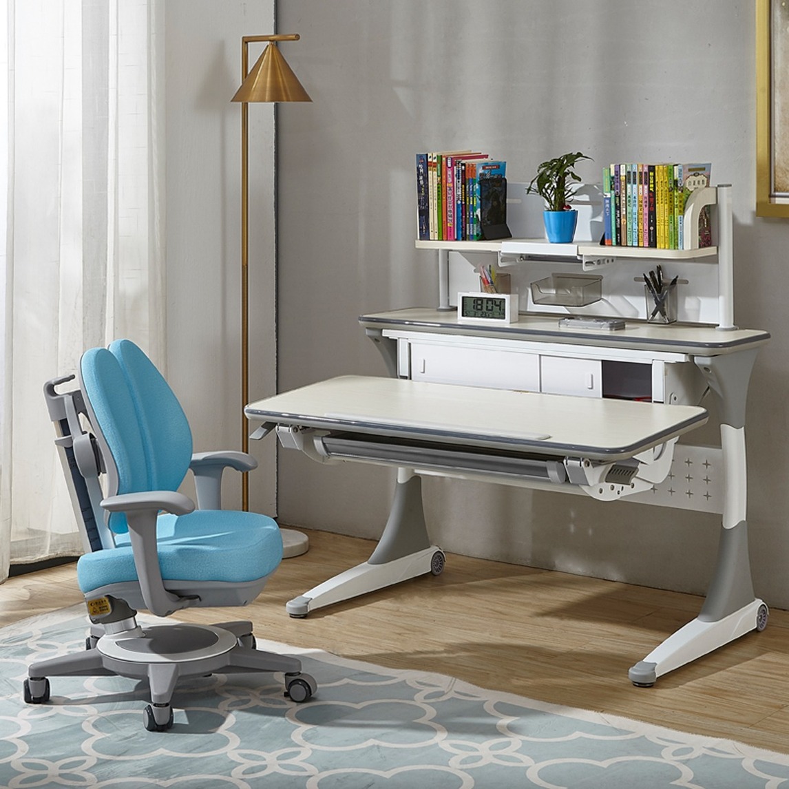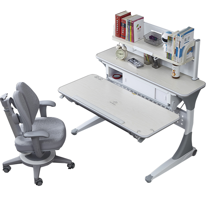 采用人体工学设计的儿童书桌,带有两层置物架,不仅可以自由升降高度,桌面也能进行倾斜,给孩子一个舒适的角度。