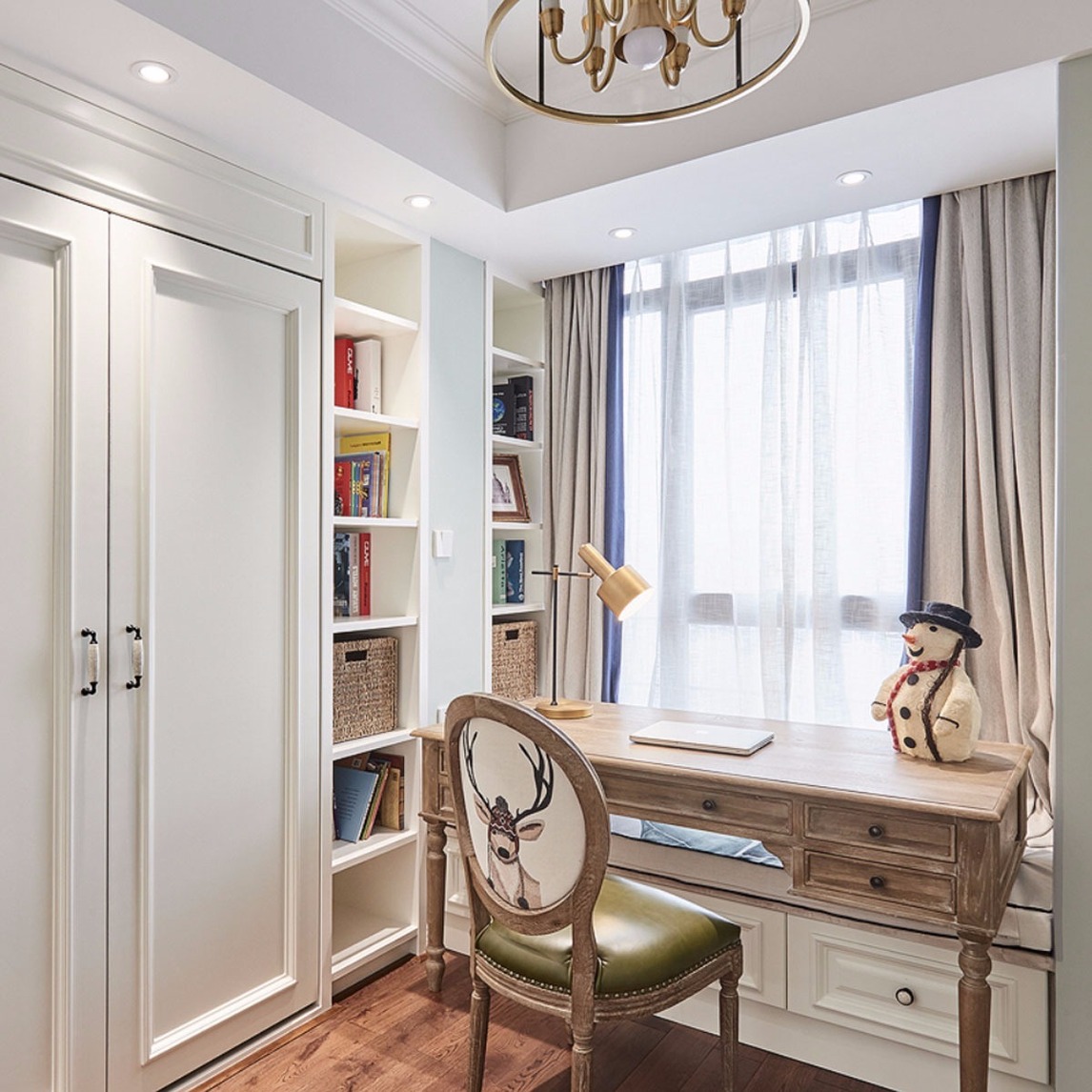 在家设计一个清净之地,偶尔看看书陶冶情操,美式实木书桌充满颜值的同时又兼具很好的质感,实木鹿头靠背椅让你在工作和看书时候更加舒适,全铜玻璃波纹吊灯美观大气,凸显原始气息,整体感觉给人温馨而舒适的视觉感...展开