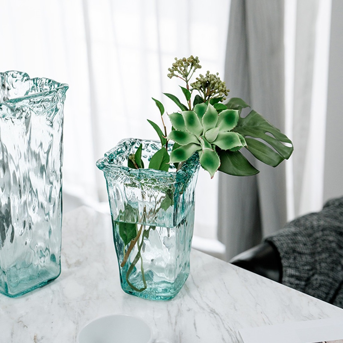 人工吹制玻璃,大尺度、色泽明快,不同时节阳光投射下还可产生迷人的光泽,朴实诚挚且优雅的方形状高瓶身搭配水蓝色玻璃瓶,充满艺术气息。