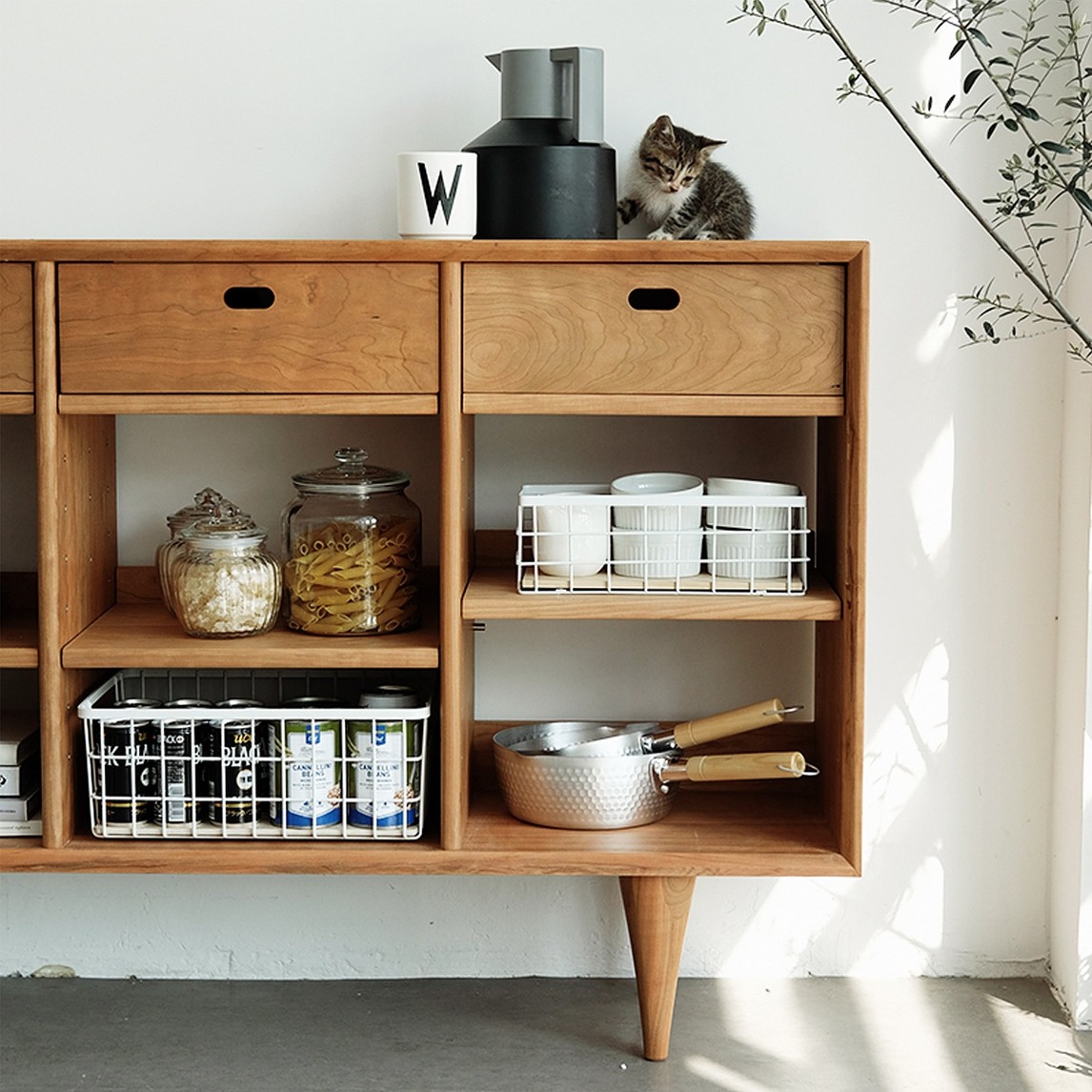 很有生活美感的餐厅一角,实木的餐边柜,规整的放着日常煮粥或者热牛奶的不锈钢小锅,还有保温水壶等,迎着阳光,很是温馨!