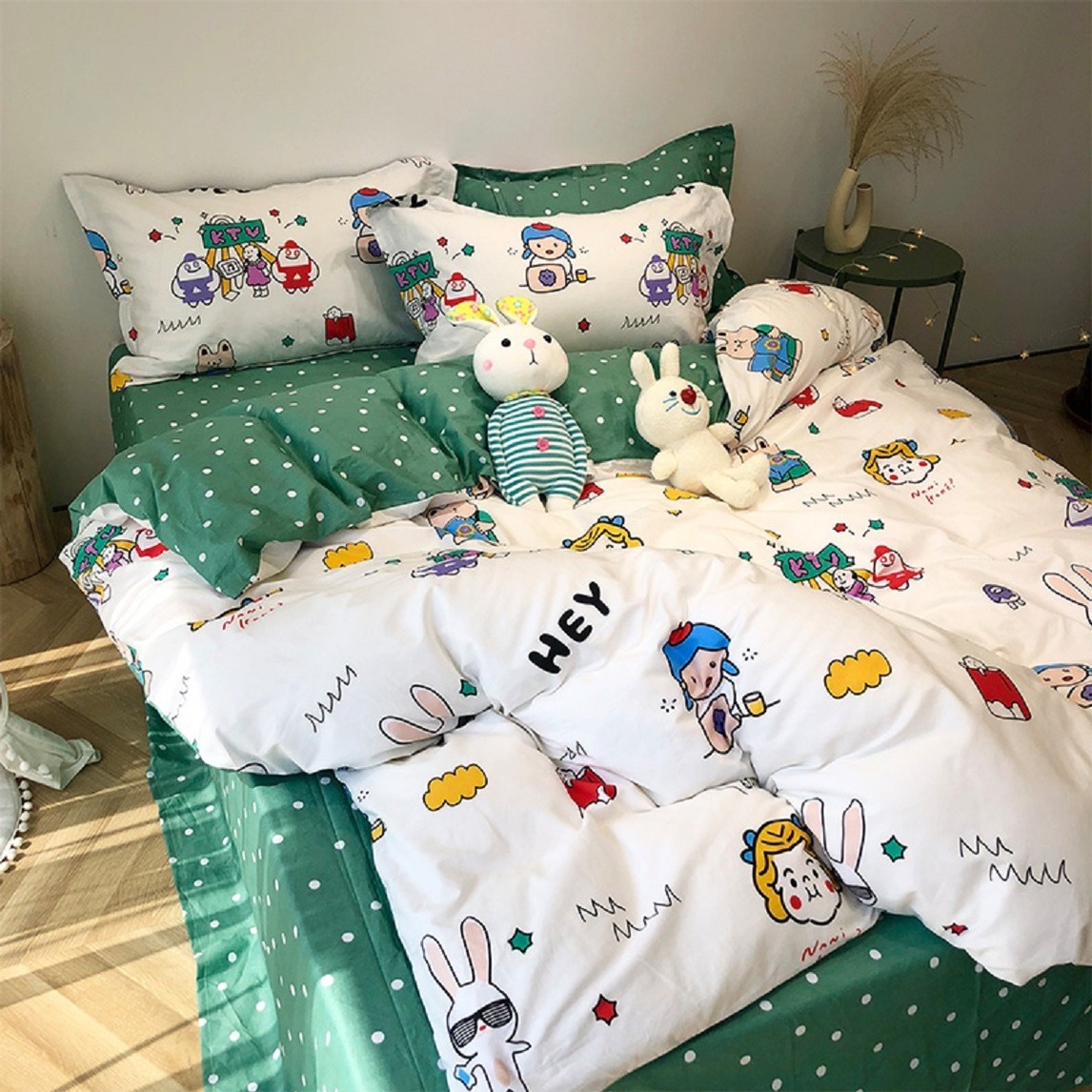 日系呆萌卡通元素,Get到骨子里的小可爱! 儿童房和仙女房可随意切换哦~ 面料是100%全棉的,强烈建议爱出汗的宝宝购买纯棉床品, 柔软舒适,吸湿又透气,四季通用哦~