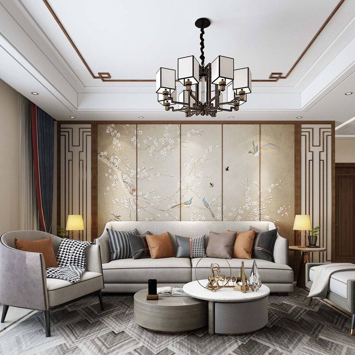 客厅地面铺设灰色亚光地砖,显得整个空间宁静素雅。电视墙用实木花格配墙布,科技木线条收边,高贵上档次。墙面暖灰乳胶漆和地面整体呼应,顶面中式主灯,整体风格为新中式,布艺中式家具更是凸显了主人家的文化底蕴...展开