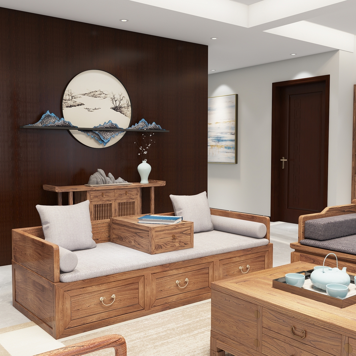 本案将文人雅士之闲情寄于生活中,以新中式的包容开阔之态接纳万物,选取老榆木材质的家具,隐去传统雕龙画凤,汇合现代手法,融诗语画情于一体,彰显东方的大气之姿。