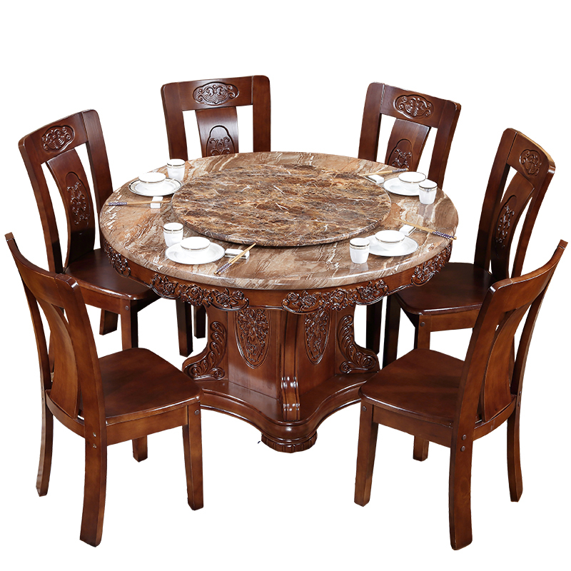 餐厅背景是大理石的花卉纹理样式的,给空间增加一些韵味感。木质餐桌和皮质坐垫餐椅,都给人一种舒适致雅的感觉。