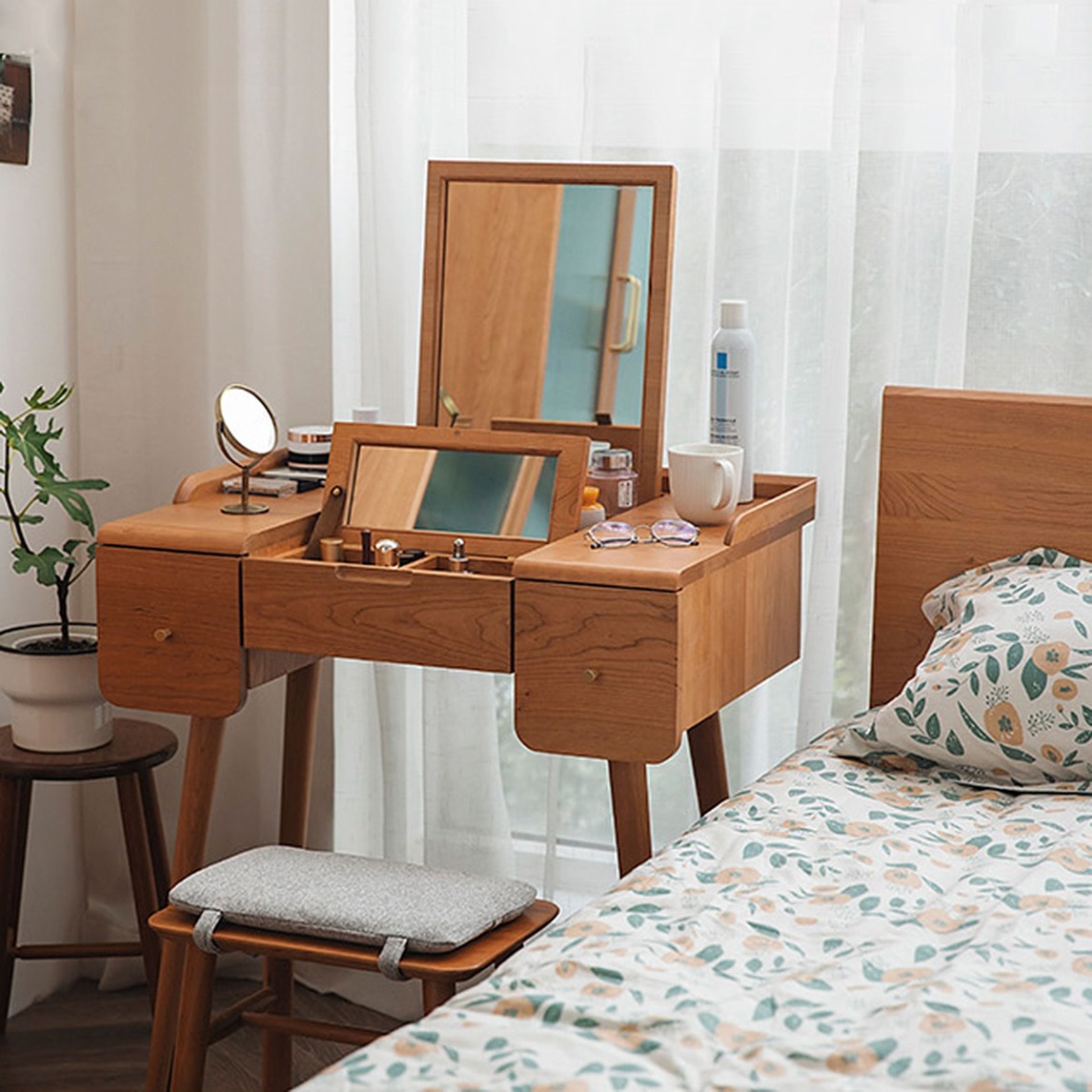 小仙女们的卧室怎么能没有梳妆台。只是空间太小,该如何布局?将床头柜的位置空出,替换大容量的床头柜,满足更多使用需求。