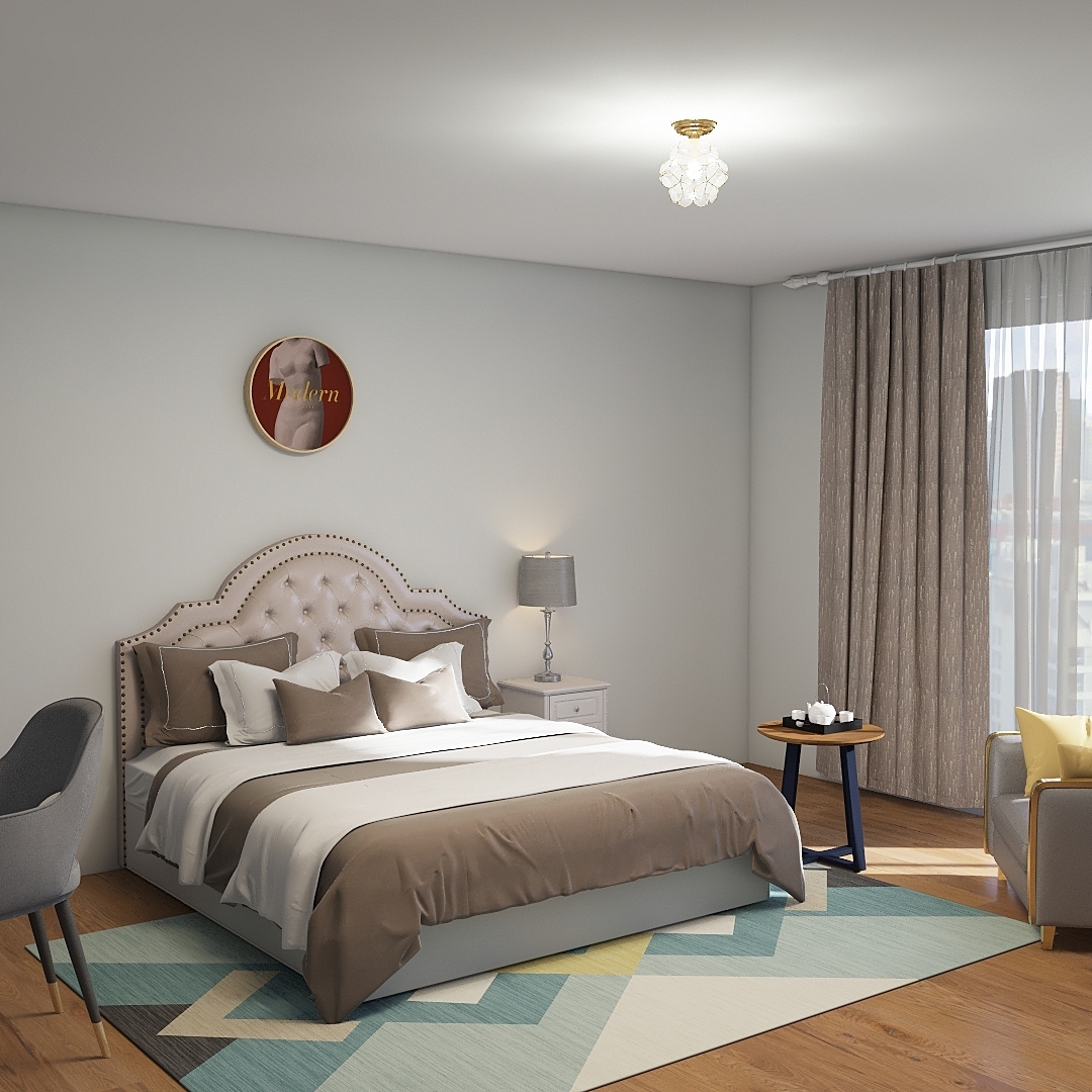 纯净的米白色美式床头搭配白色的美式床头柜是最不会出错的选择,加入了床品的情况下,床头的挂画采用更深的红色系,增加了空间的层次感。北欧风的几何图案地毯与美式风格形成对比,而有了边几和休闲沙发的映衬,并不...展开