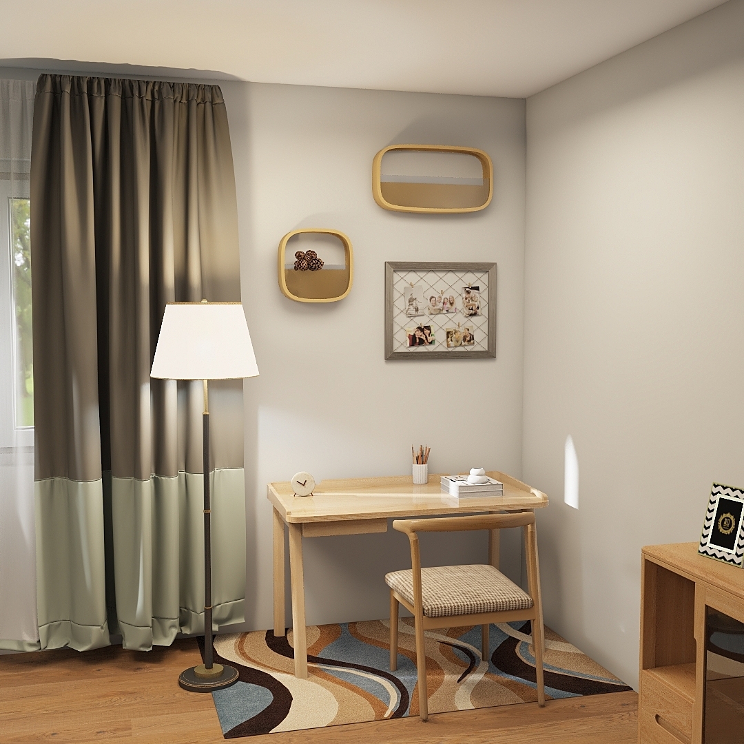 卧室一角的空间用来打造一个学习或办公区域是最高效的空间利用方式,按照卧室整体的装修风格,书桌椅选择成套的更为省心。必备的照明光源和置物架是提升舒适度的关键,一张舒适的地毯也是增加使用频率的原因之一。