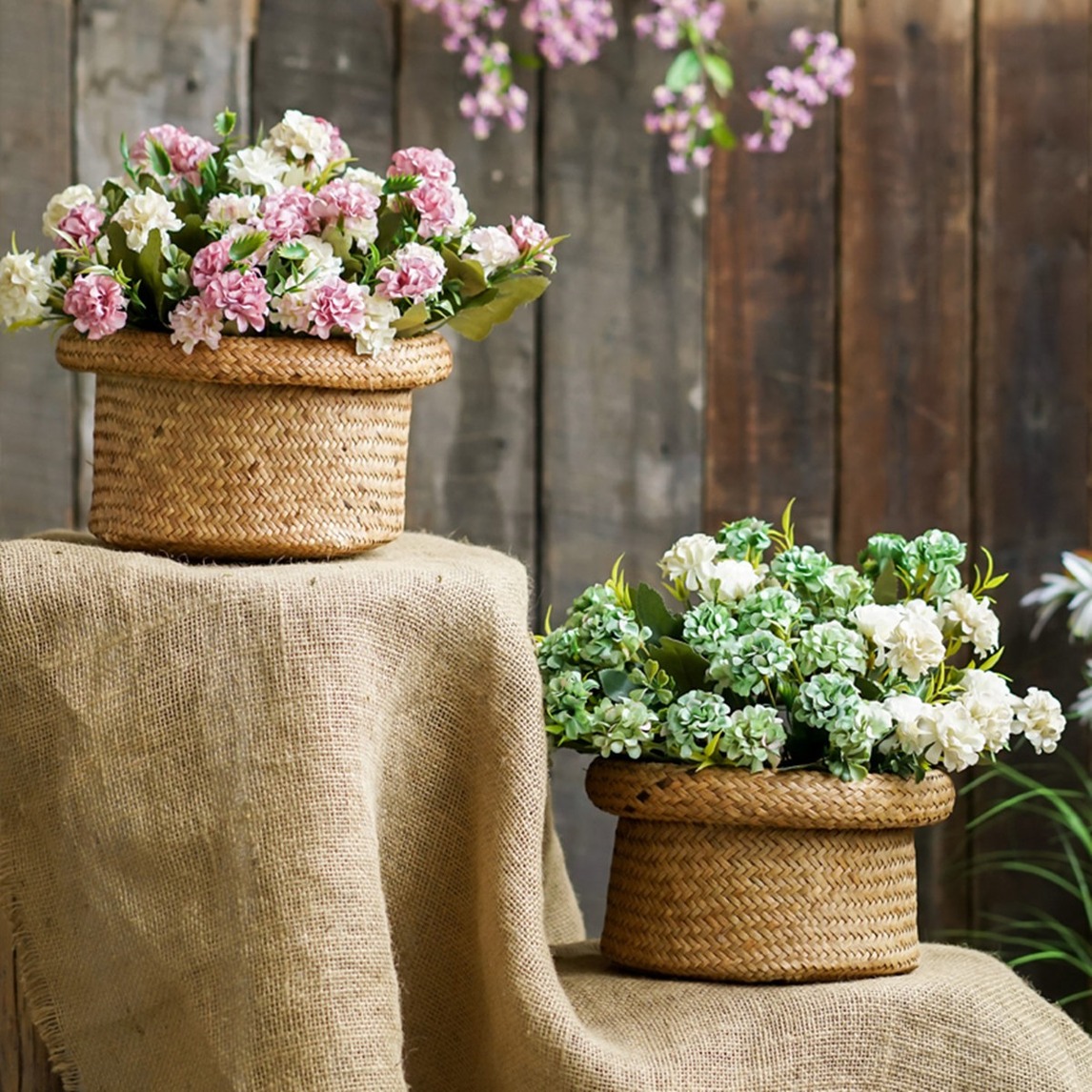 花朵均被着色古朴的叶片包裹其中,而叶片与花朵之间夹带着一株特色绿植,绿叶衬红花的感觉,所以清新自然美得有格调。
