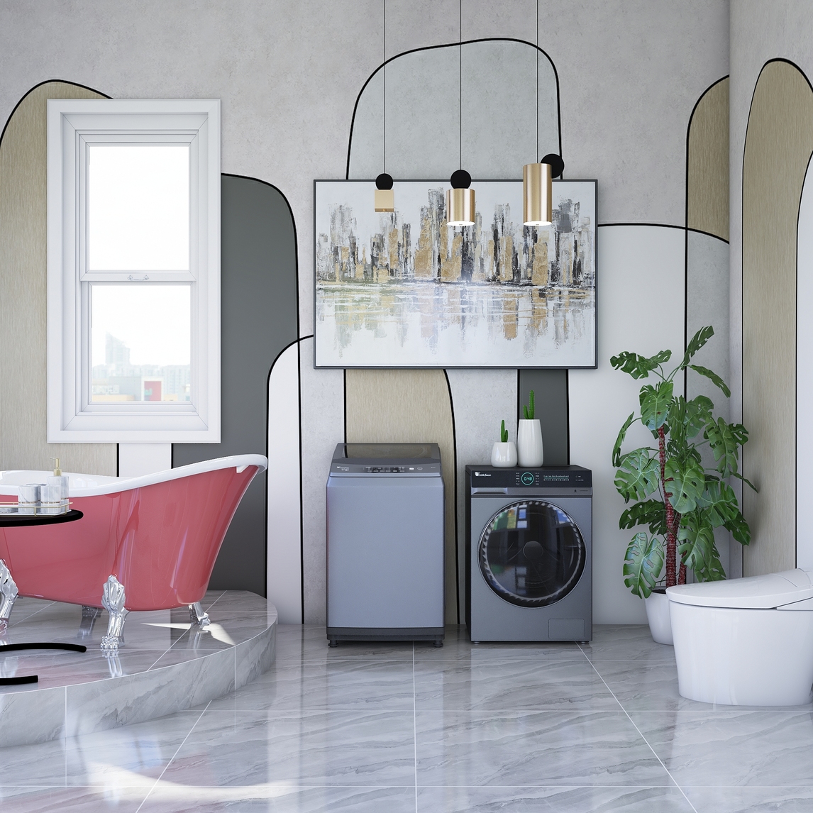 设计师说: 轻奢风格的卫浴间,颜色丰富,有清新的白色和明亮的粉色系,有低调的米色系和灰色系,还有高雅的灰色系。灰色系的金属钛小天鹅洗衣机,位于视觉中心,吸引了人们的目光。同样让s人瞩目的是它们强大的功...展开