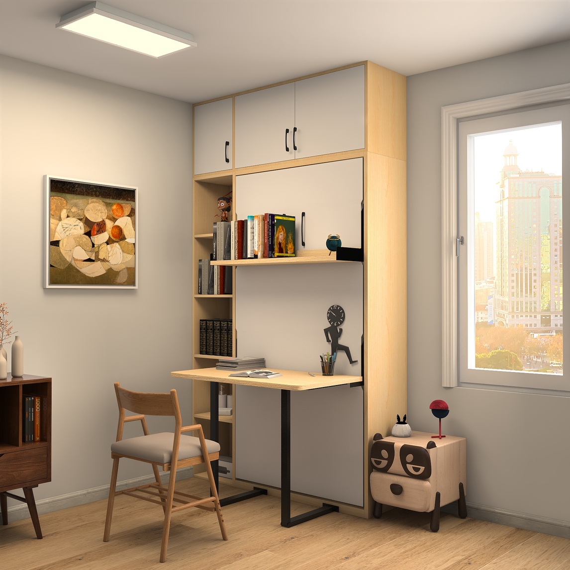 实用美观的儿童房,书桌、床可折叠的设计,可以腾出很多的空间,孩子再喜欢蹦跳也不怕。 更多的储藏空间,更多的活动空间。